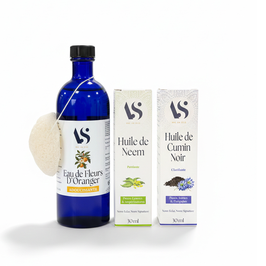 L’Eponge Konjac nettoie la peau sans l’irriter, l’Eau florale d’Oranger apaise et rééquilibre, l’Huile de Nigelle s’utilise comme sérum léger pour réguler l’excès de sébum, et l’Huile de Neem agit localement sur les boutons ponctuels.