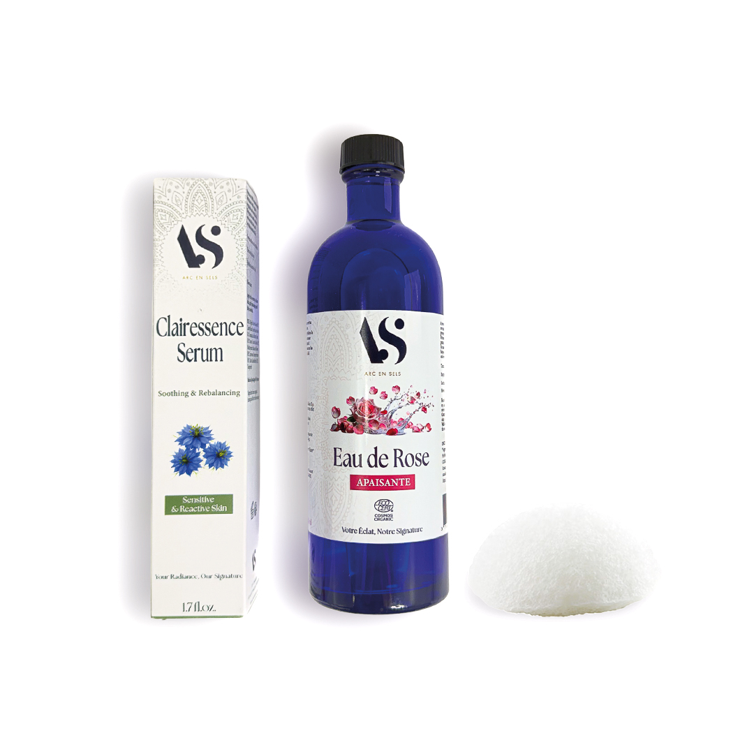L’Eponge Konjac nettoie en douceur, l’Eau de Rose apaise immédiatement, et le Sérum Clairessence renforce la barrière cutanée tout en diminuant la sensibilité jour après jour.